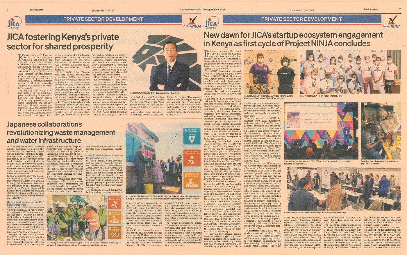 ケニアの経済新聞にて、当社の活動が取り上げられました。 2024.03.04 ケニアの経済新聞Business Dailyにて、当社の活動が取り上げられました。 当社は、ケニアでの水道問題解決に向け、JICA(国際協力機構)と協力して活動を続けています。 2月にはケリチョウ郡にて約12km延長の水道管を新設しました。 当社が現在進めている「水道施設における無収水対策・管継手導入に係る普及・実証・ビジネス化事業」は 外務省(日本政府)とJICA(国際協力機構)が連携して進める「中小企業・SDGsビジネス支援事業」として採択されたものです。