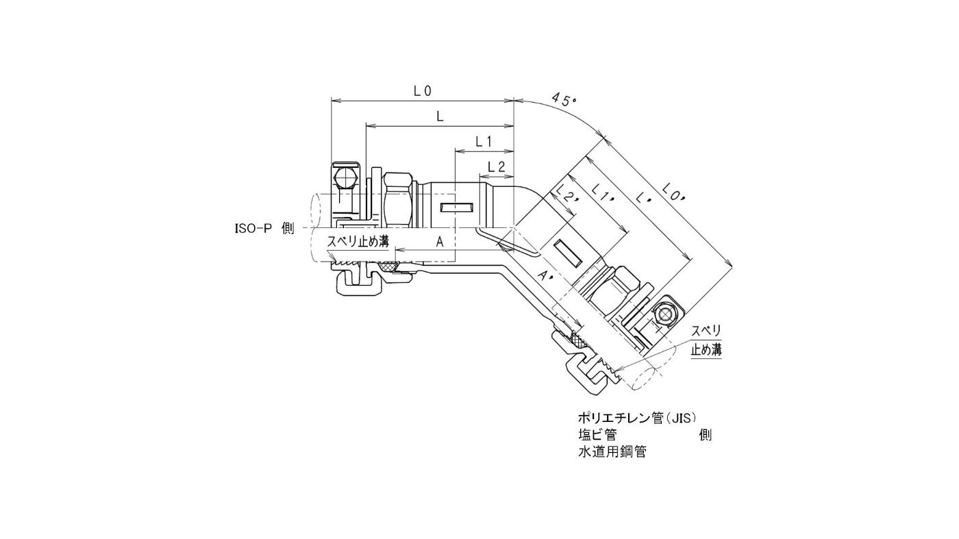 SKX ISO-P用 SKX45°エルボ 略称:SKX-45L 呼び径 各部寸法 A LO L L1 L2 A' L0' L' L1' L2' ISO-P50(JW-P) 67 111 86 30 14 - - - - -