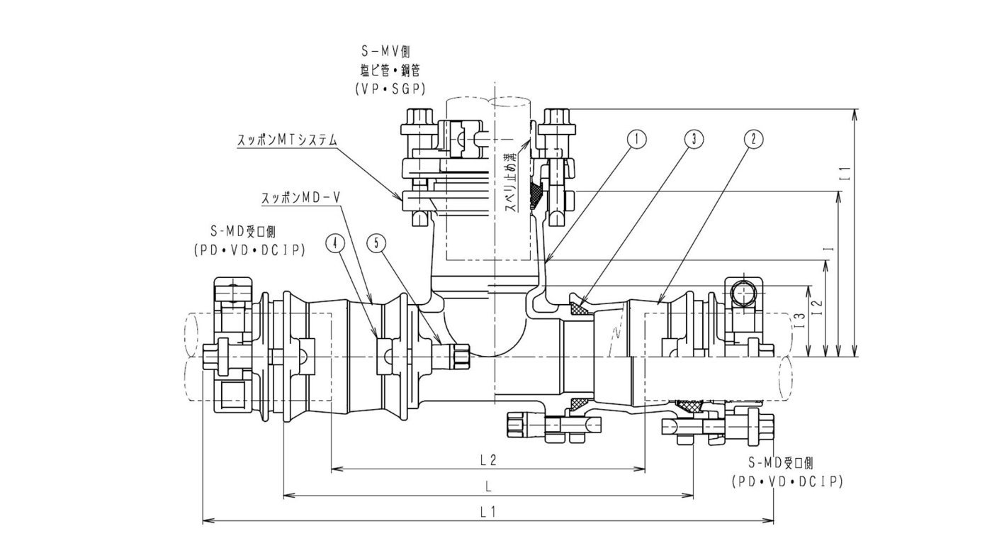 主管・既設管:ダクタイル鋳鉄管  ×  枝管・取り出し管:塩ビ管・鋼管/ポリ管(JIS)・SUS管用