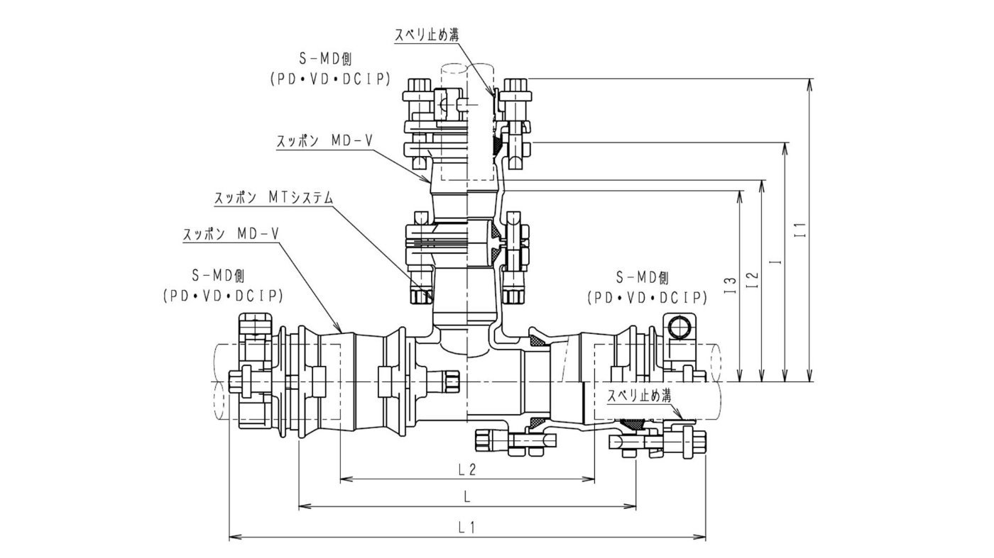 スッポンMシステム スッポンMTシステム-D×D 主管・既設管:ダクタイル鋳鉄管 × 枝管・取り出し管:ダクタイル鋳鉄管 略称:S-MT・ST-D×D 仕様 各部寸法 呼び径 L L1 L2 I l1 l2 D75×D75 434 586 332〜296 317 393 266 D100×D75 486 638 378〜338 332 408 281 D150×D75 510 702 382〜348 352 428 301 注)L2MAXは、パイプの規定挿入量を基にして算出。 ※アダプター品となります。