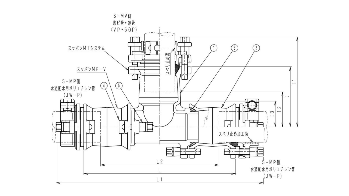 主管・既設管:水道配水用ポリエチレン管(ISO-P)  ×  枝管・取り出し管:塩ビ管・鋼管/ポリ管(JIS)・SUS管用