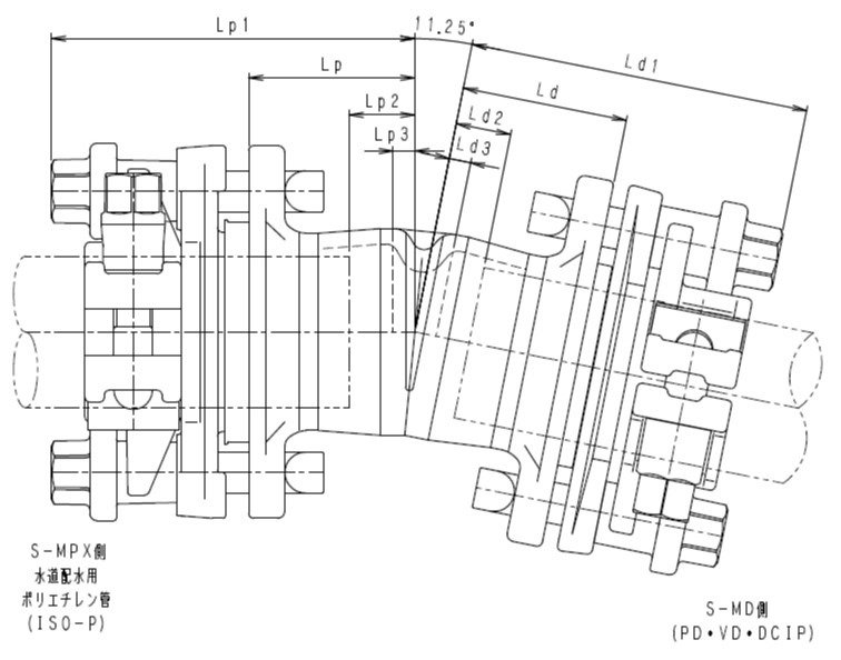 スッポンMPX スッポンMPX ショートMP-D-B 11 1/4° 水道配水用ポリエチレン管 × ダクタイル鋳鉄管(75・100)・内外面被覆鋼管 略称:S-MPX-MP-D-BS 11 1/4° 呼び径 各部寸法 Lp Lp1 Lp2 Lp3 Ld Ld1 Ld2 Ld3 ISO-P 50×D 50×11 1/4° 69 141 27 9 69 140 23 9 ISO-P 75×D 75×11 1/4° 100 176 53 10 79 155 28 15 ISO-P 100×D 100×11 1/4° 107 183 40 14 95 171 41 26 ISO-P 150×D 150×11 1/4° 115 220 45 20 108 204 44 28