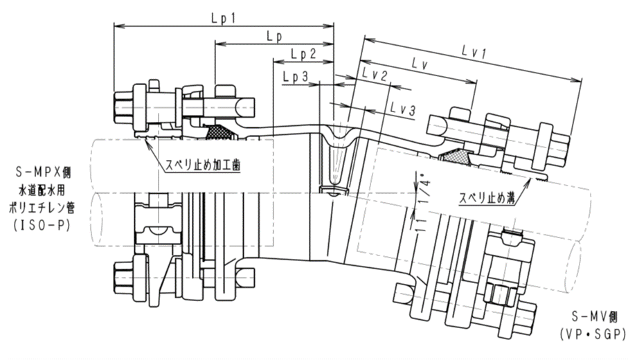 スッポンMPX スッポンMPX ショートMP-V-B 11 1/4° 水道配水用ポリエチレン管 × 塩ビ管・鋼管/ポリ管(JIS)・SUS管 略称:S-MPX-MP-V-BS 11 1/4° 呼び径 各部寸法 Lp Lp1 Lp2 Lp3 Lv Lv1 Lv2 Lv3 ISO-P 50×V 50×11 1/4° 69 141 27 9 69 140 23 10 ISO-P 75×V 75×11 1/4° 100 176 53 10 100 181 27 10 ISO-P 100×V 100×11 1/4° 107 183 40 14 124 209 41 29 ISO-P 150×V 150×11 1/4° 115 220 45 20 132 226 41 27
